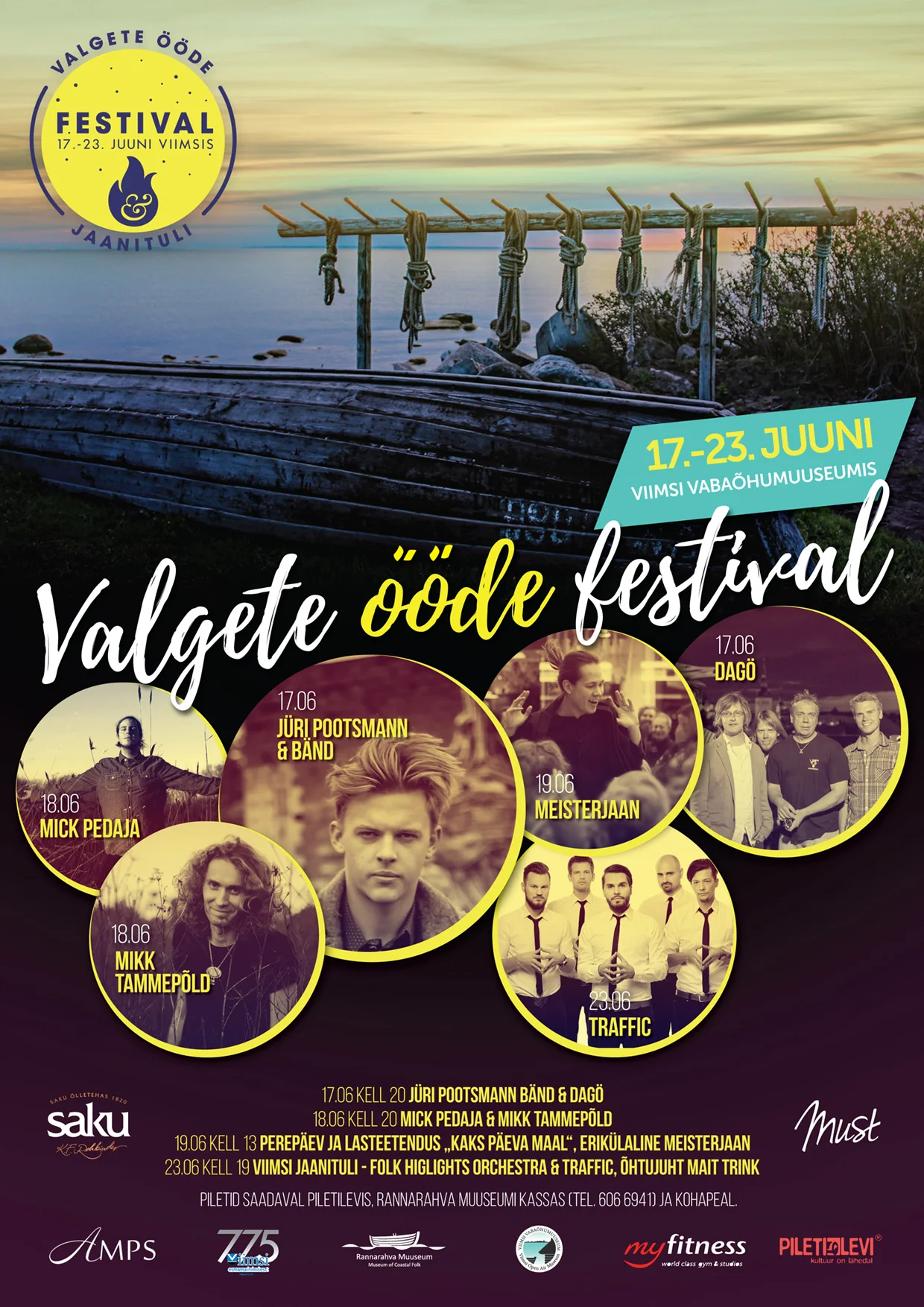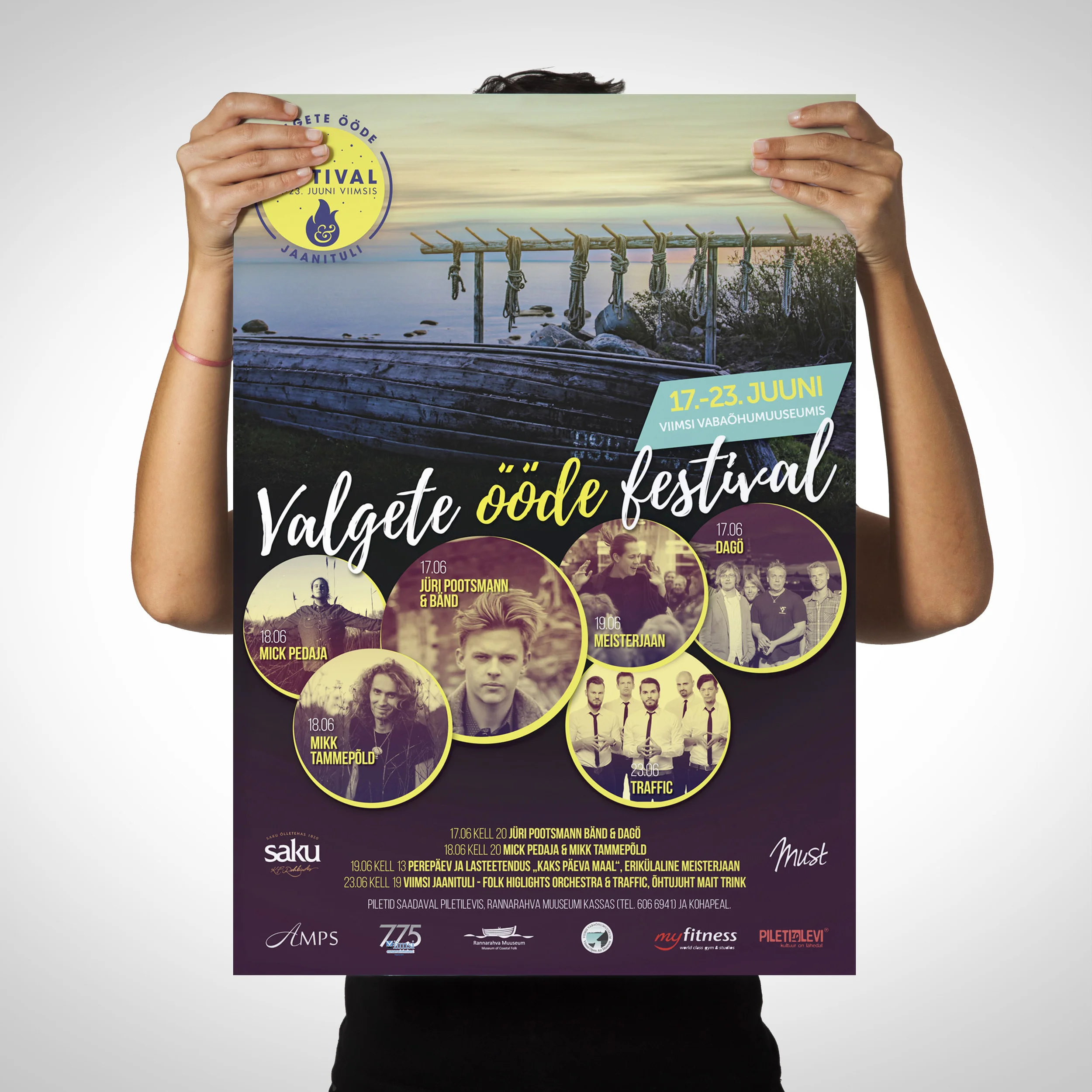 Valgete ööde festival ehk VÖF sai 2016 aastal uue näo. Pealkirjas sai kasutusele võetud uus mänglev font ning artistid sai paigutatud ööteemale sobilikesse noorkuu laadsetesse ringidesse. Kuna tegevuse toimumiskohaks on kauni vaatega vanahõnguline Viimsi Vabaõhumuuseum, siis taustapildiks sai valitud seal kohapeal tehtud foto. Värvide kasutus oli inspireeritud purpursest päikeseloojangust ja roosakas-kuldsest päikesetõusust, mida jaanipäevapaiku just öösel aset leiavad.